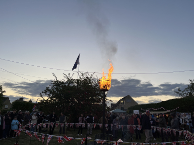The afternoon followed by teas and cakes being served along with ice creams too. We had an excellent jazz pianist and singer to keep us entertained. As evening descended, the pulled pork rolls appeared (very tasty!) and a special guest “Winston Churchill” who gave us a rendition. It was very powerful and moving. Jenny announced the proclamation and then the beacon was lit.